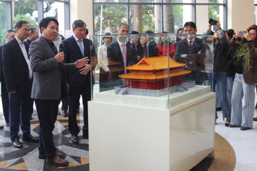 Hình ảnh 3D kiến trúc cung điện Kính Thiên thời Lê Sơ được trưng bày, giới thiệu tại sự kiện. Ảnh: VASS.