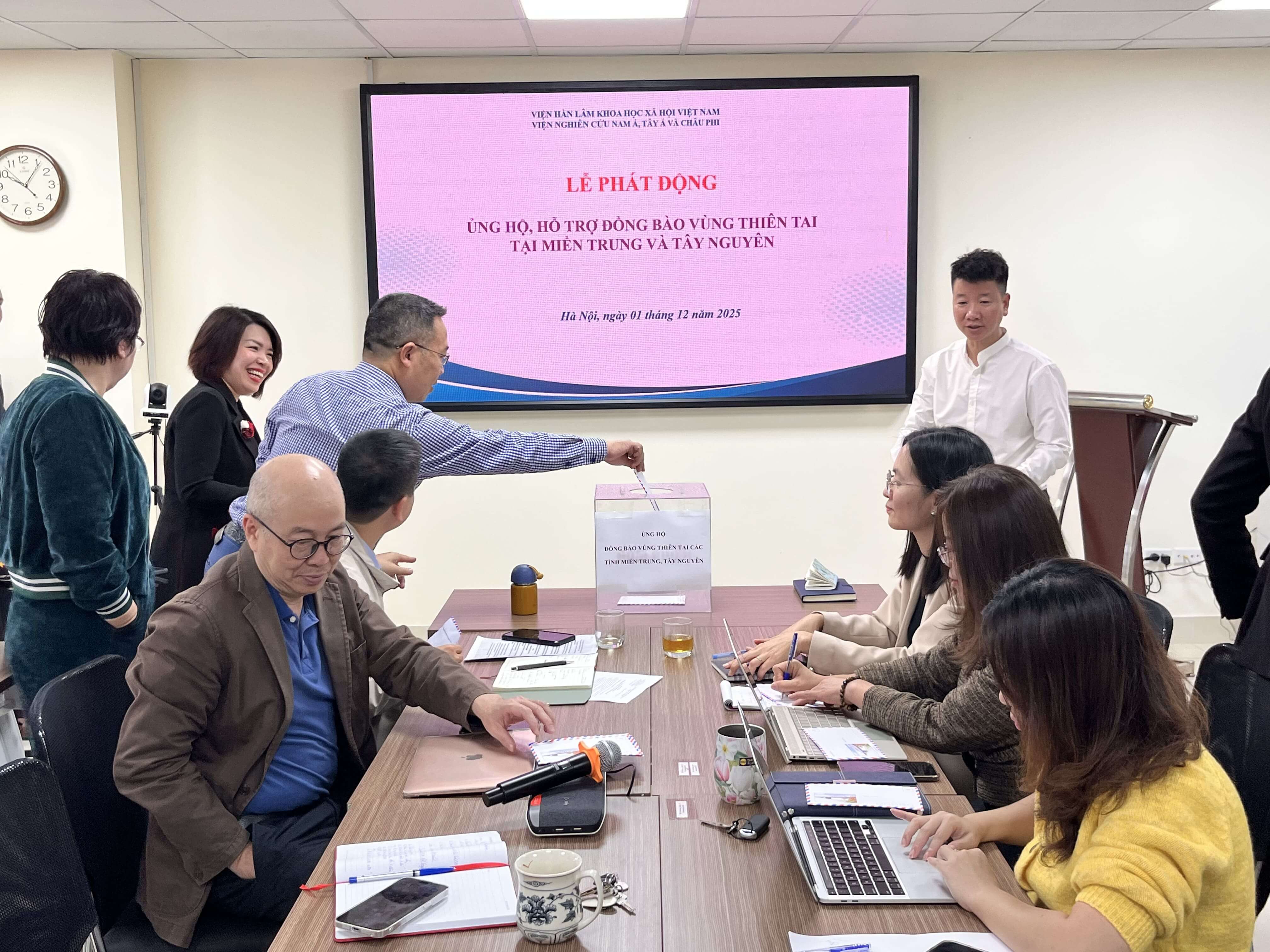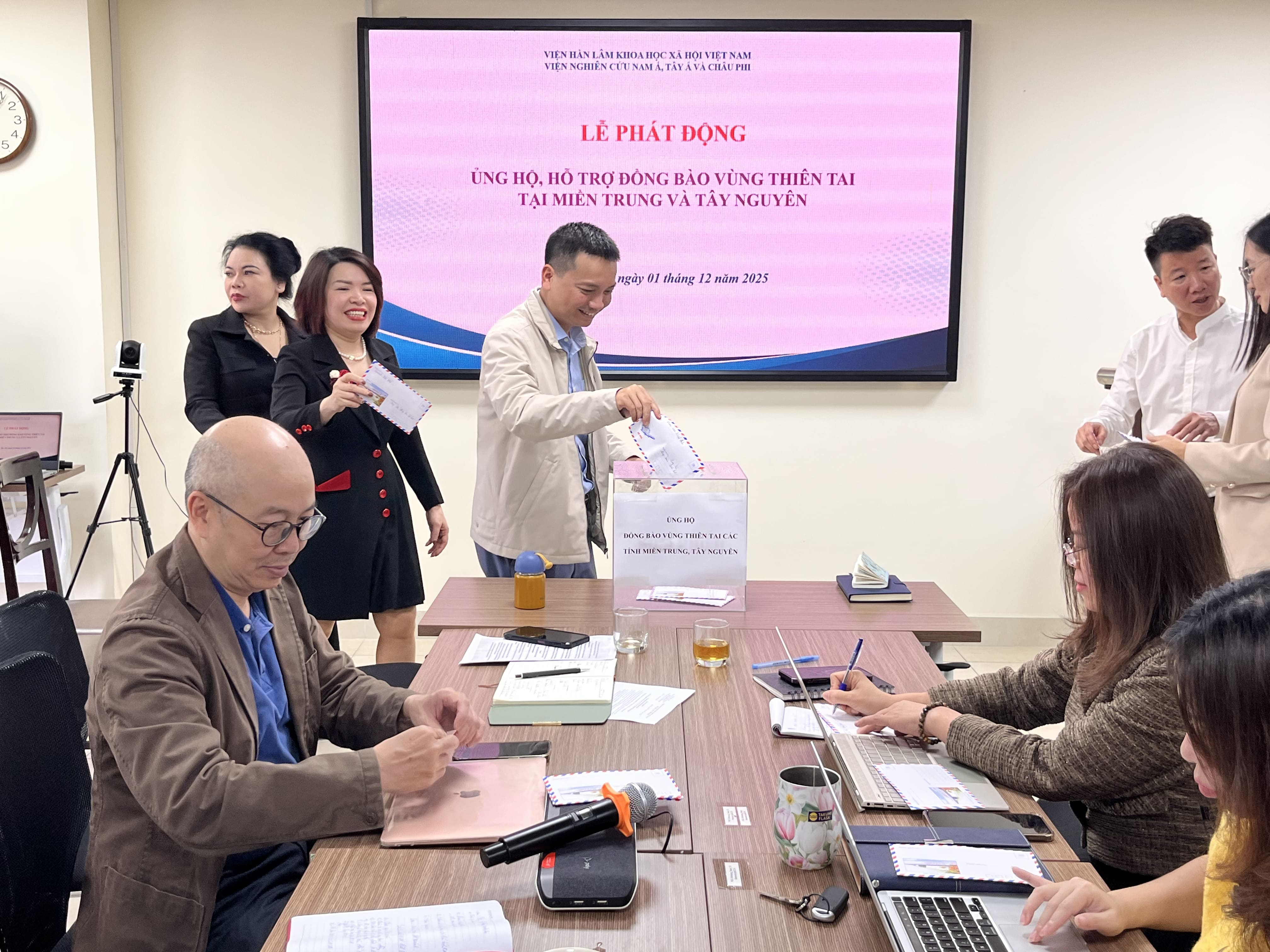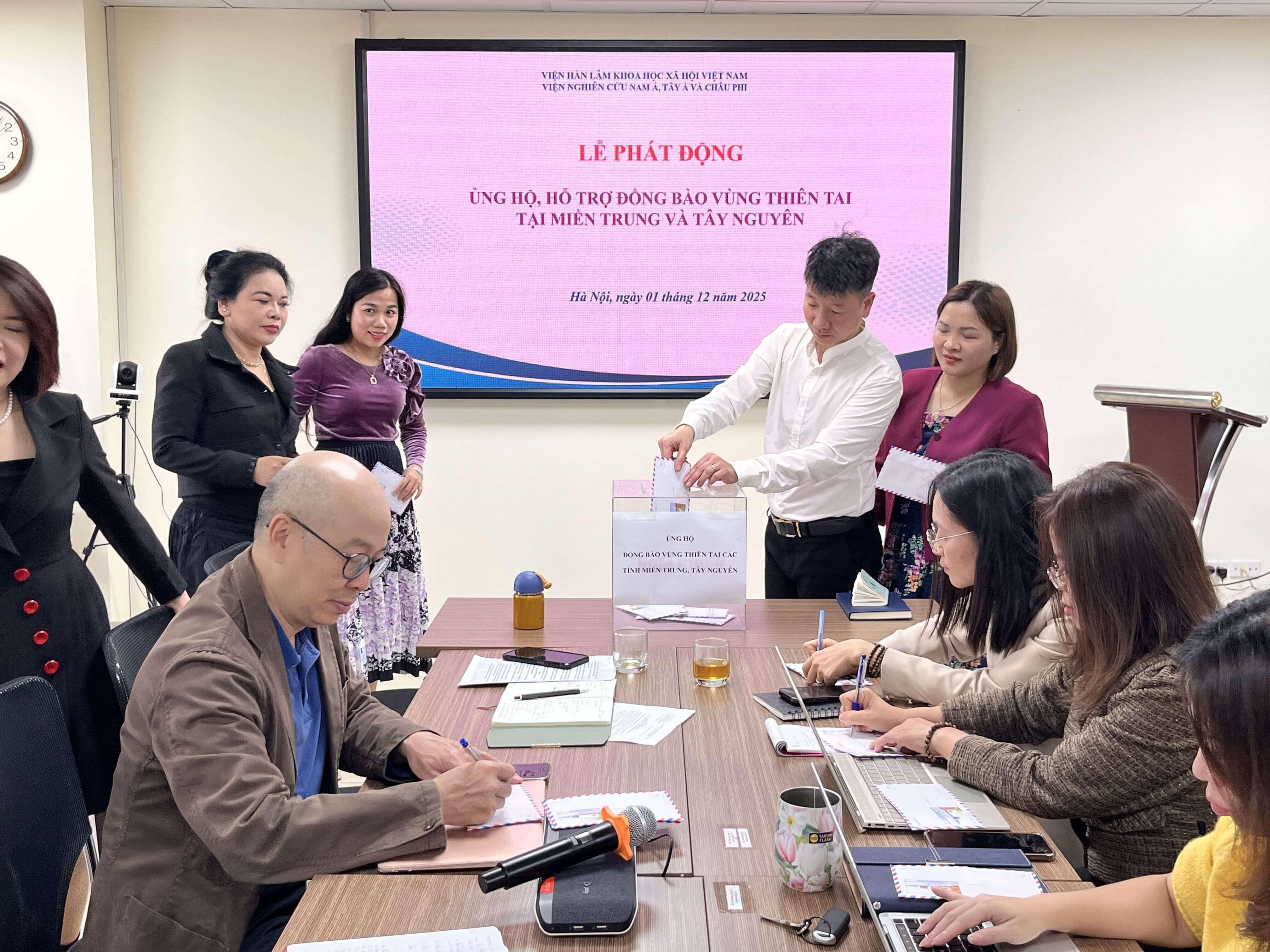 Sáng ngày 1/12/2025, tại trụ sở 176 Thái Hà, Viện Nghiên cứu Nam Á, Tây Á và Châu Phi đã tổ chức phát động quyên góp ủng hộ đồng bào khắc phục hậu quả nặng nề do bão số 13 gây ra.